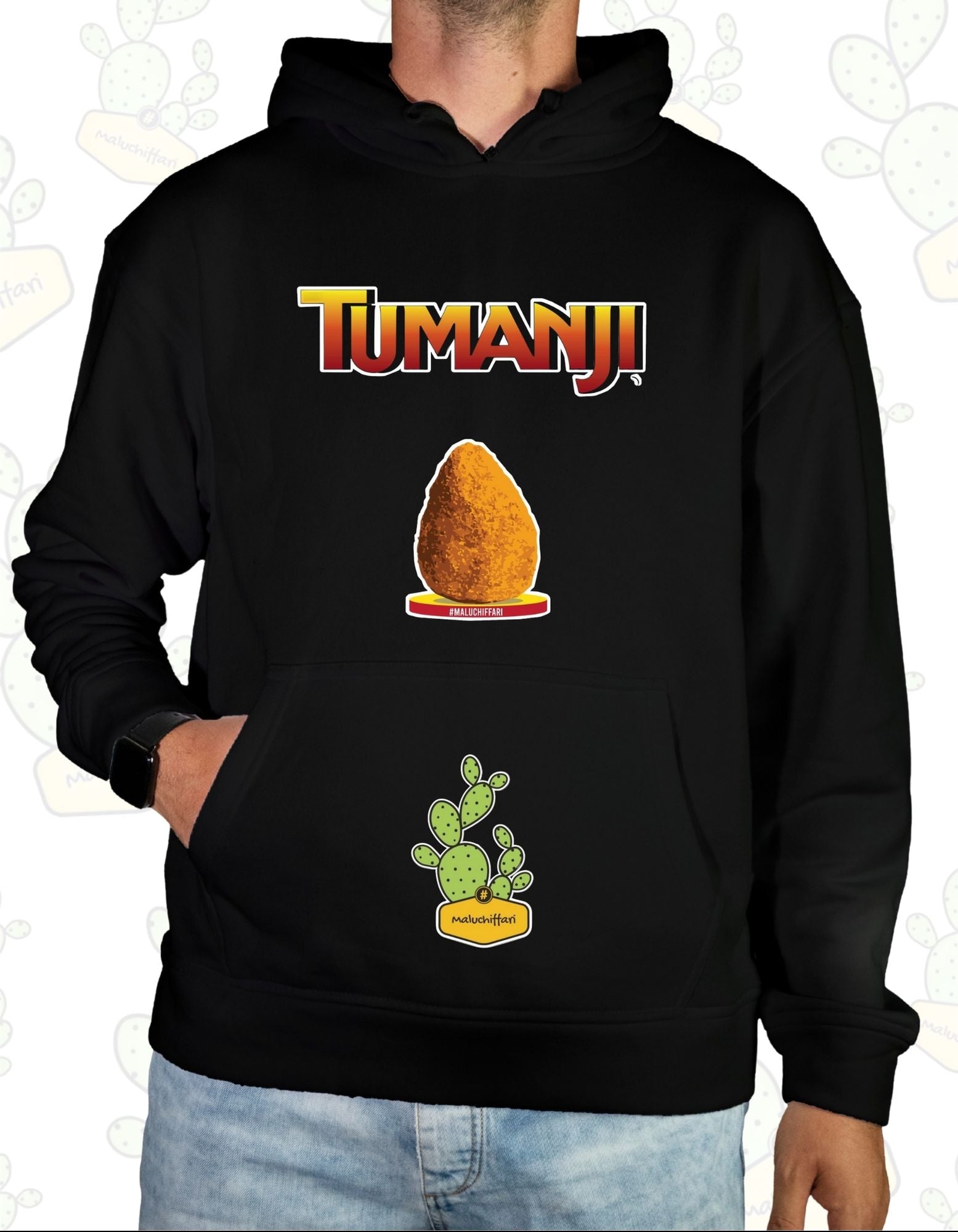 Felpa comoda, tosta, irriverente: la felpa con cappuccio firmata Maluchiffari è fatta per cu si voli sentiri stilusu pure quannu fa friddu.